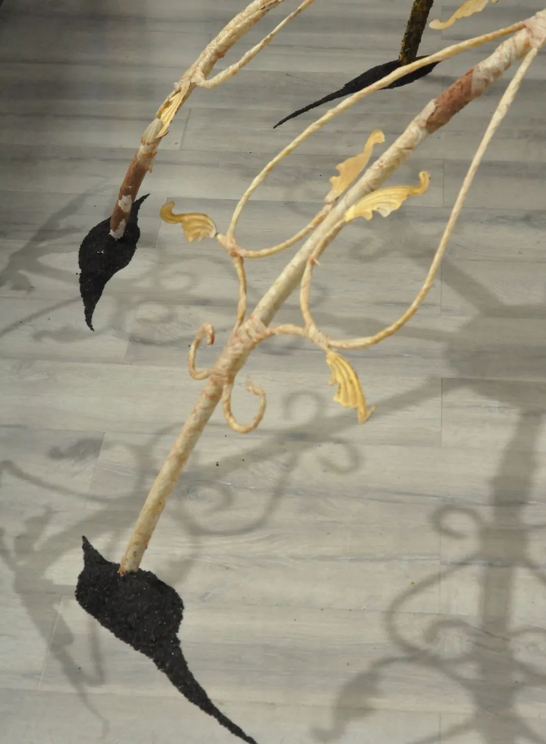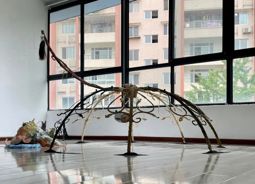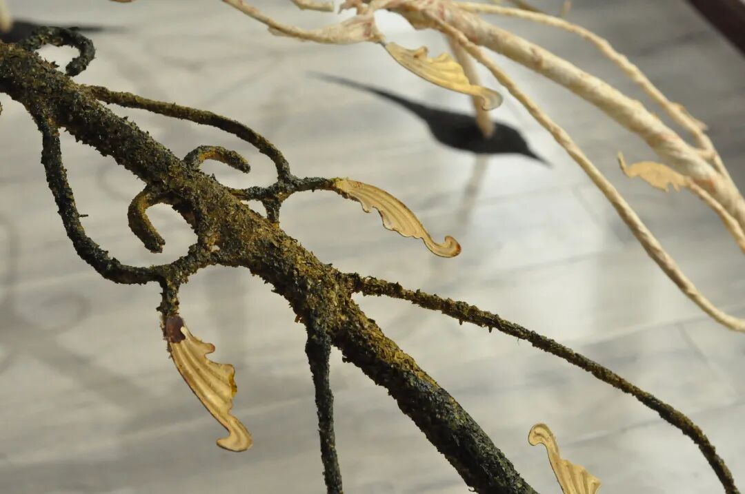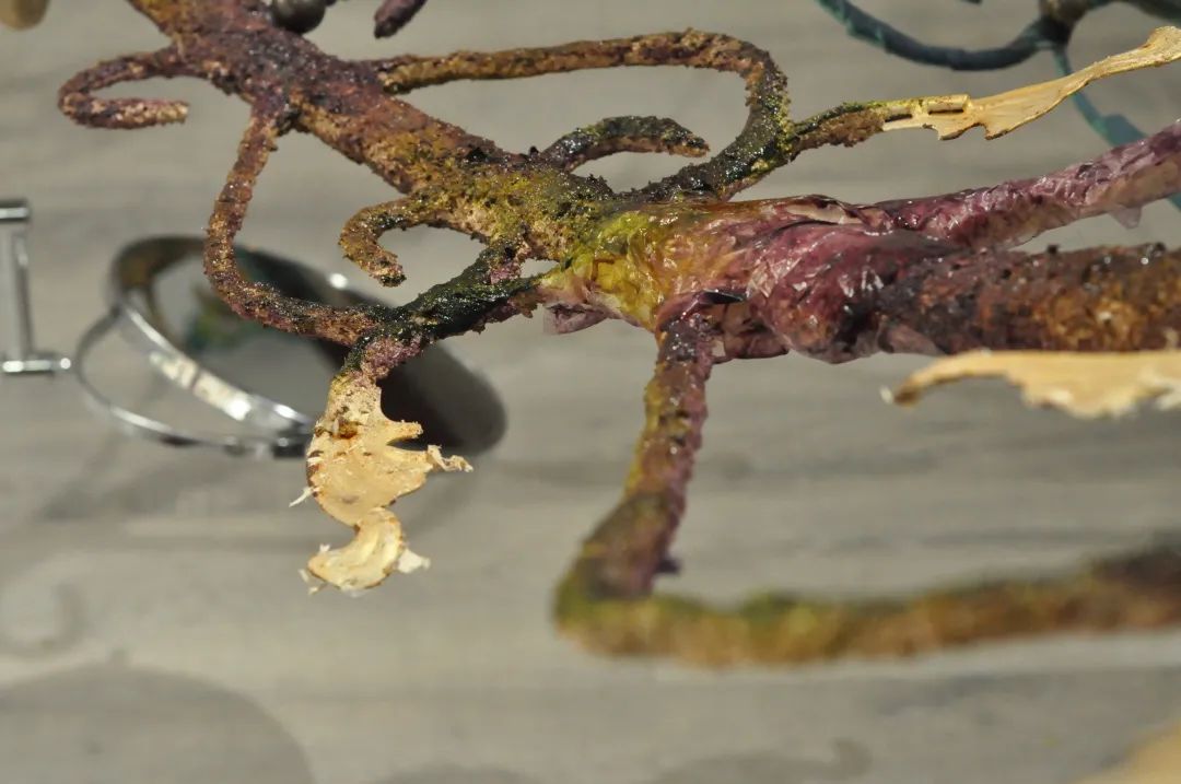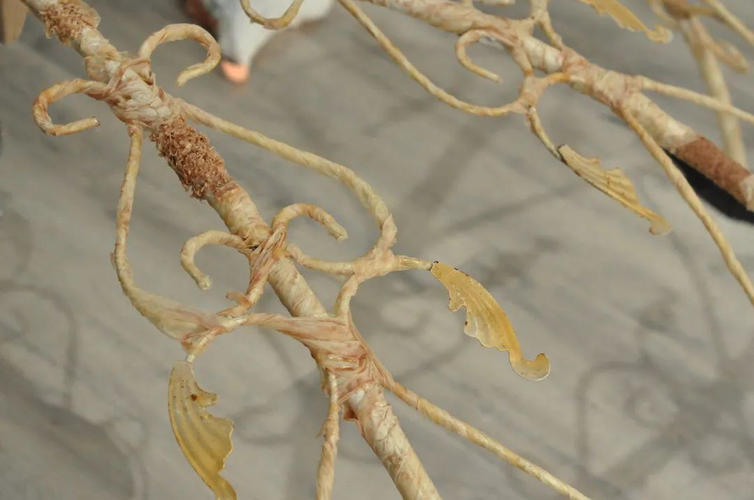 艺术家秦畅在成都AVG空间两个月的驻留结束后,呈现“双螺旋漫步”个展。骨骼钢架的镂空纹样投射出的光影和油脂的湿度让人产生呼吸感,肠衣的气味使人略感不适,苔藓上木漆的颜色增强氛围感。扁平化的地球,也是有正反两面。透过右下角的空洞,可以看到另一片花花世界。永远不会凋谢的金花与已经干枯折断的残花,体现着材料本身的属性。对于现成品的艺术化处理,使得符号产生时间错乱。