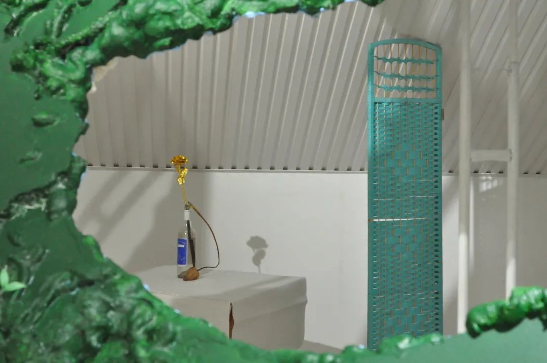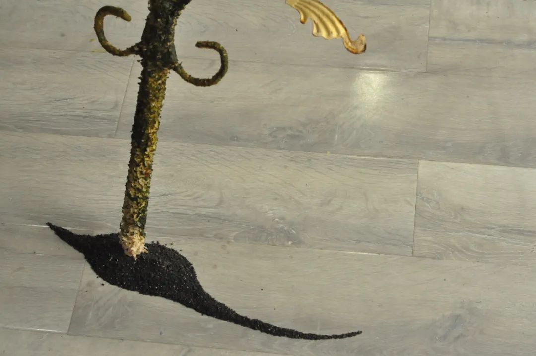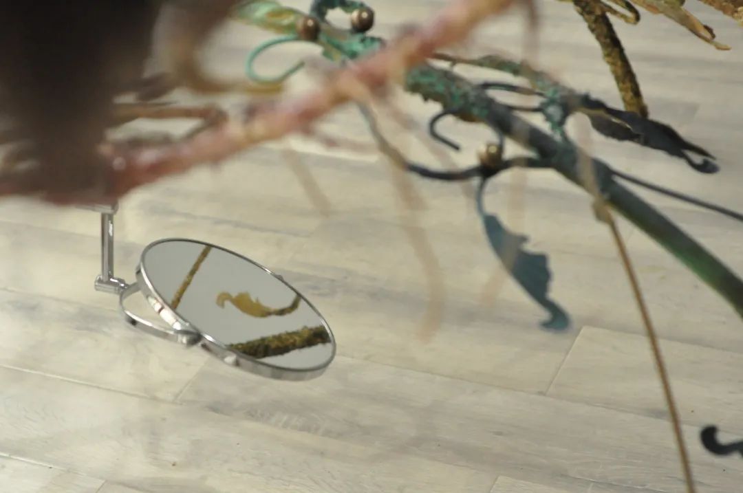 肠衣、苔藓和油脂的结合,使人漫步在森林深处,偶然看到一个提着钥匙的婆婆,身披紫霞斗篷,篮子里的麦丽素散落在沼泽上,草地中……篮子下面伸出一面镜子,不仅能看到森林的背面,通过光的反射,在天花板上看到花影。每个材料本身有自己的属性,艺术家秦畅打破他们的常规位置和使用方式后,也就是解构后的的重组,形成新的概念,就会呈现抽象化的表达。当某种物体失去它本身的作用和意义,每一种材料的选择都有着经过改变位置或者加工处理后的象征性。同一个符号又具有不同的象征性。