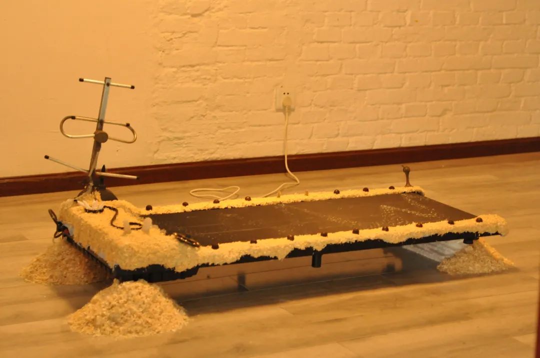 一个人的时间是有限的,但是时间本身是无限的。就像一个圆的周长是固定值,但是圆周长不是一个固定值。圆心散落在不同的地方,形成钢管拼接的圆,镜子轮廓的圆,齿轮转动的圆,地板花围起的圆,黑砂画出的圆,跑步机带循环的圆……圆是最灵活的图案,也是中国人最喜欢的图案,寓意团圆美满。一个圆一个轮回,圆上的任何一个点都可以是起点,同时也可以是终点。独自坐在AVG空间的小阁楼里,跑步机的白噪声会使人产生时空错乱的感觉。看似流逝的时间,其实不然,午夜钟声总会敲响。看似确定的圆,但边界只是在个人心中。